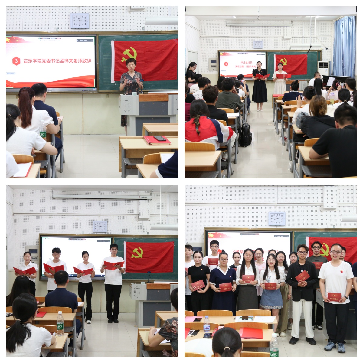 在“回顾入党历程,传承奋斗精神”环节,2024届毕业生党员代表夏坤在发言中深情回顾了自己在师大求学期间通过积极参与理论学习、寻访红色足迹、红色音乐艺术实践、红色故事巡讲等活动,不断提高思想认识和端正入党动机,提高党性修养,成长为一名光荣的中国共产党党员的历程。他表示,在未来的道路上一定积极践行党员的先锋模范作用,坚持以人民为中心,不断满足人民的精神文化需求,为建设社会主义文化强国贡献青春力量。新发展党员蒋依桔代表全体在校生党员发言。她讲述了自己在老党员的引领下,向党组织递交入党申请书并一步步端正入党动机,最终光荣加入党组织的经历。她表示在今后的学习和生活中要以2024届毕业生党员为榜样,坚守入党初心,牢记宗旨使命,不断提升自己的综合素质,始终以坚定的信念和昂扬的斗志为实现中华民族伟大复兴贡献自己的力量。