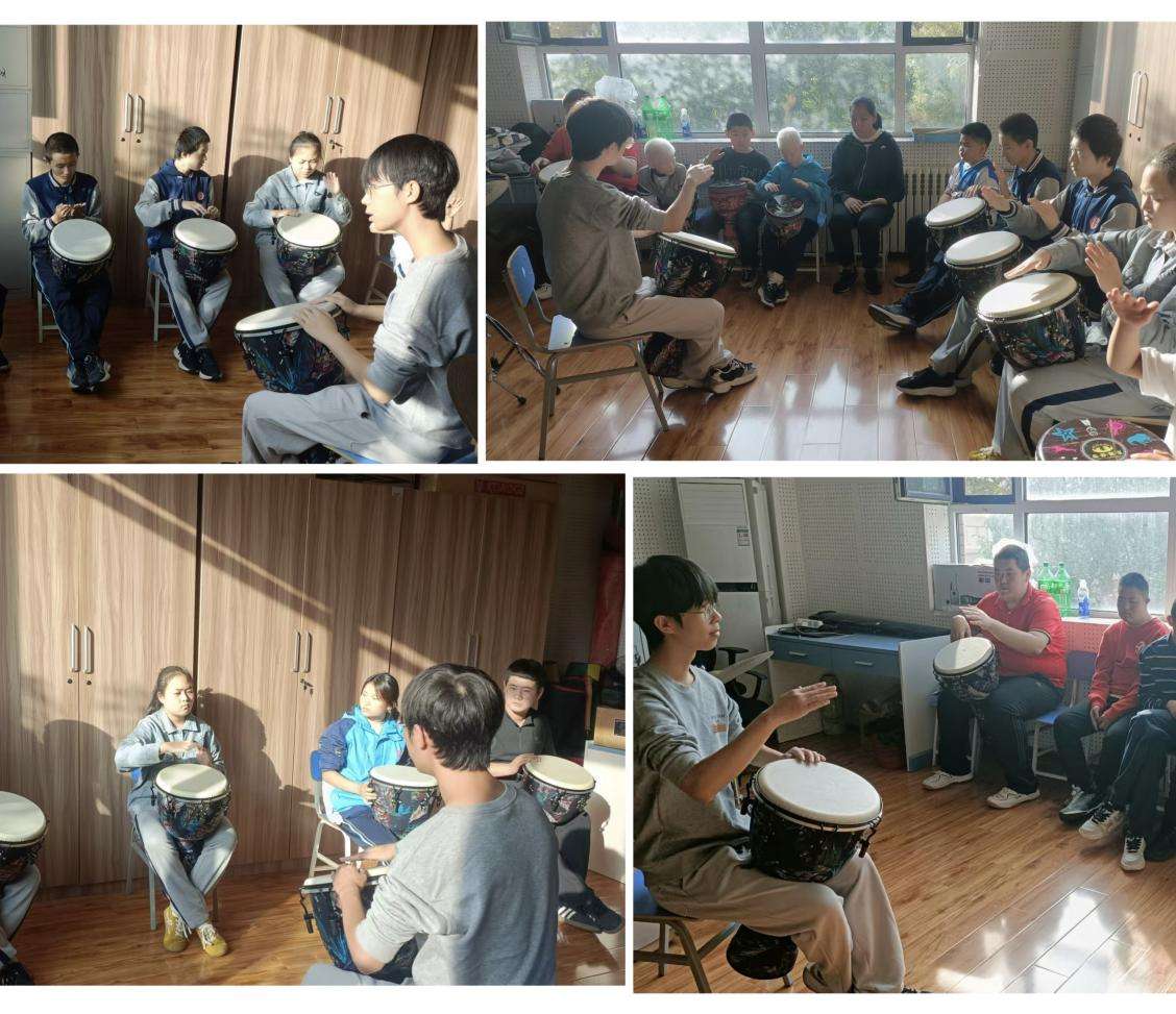 在非洲鼓课堂上,志愿者栗康皓进一步强化互动与节奏共鸣,他们手把手调整学生的击打姿势,从手掌发力方式到鼓面接触位置,逐一纠正;同时用肢体动作示范节拍,让学生们感知鼓点的强弱变化。当《离别开出花》的熟悉旋律在孩子们的击打下缓缓流淌,整齐的鼓声与欢快的笑声在课堂内交织,孩子们脸上洋溢着自信的笑容,眼中闪烁着对音乐的热爱与向往。